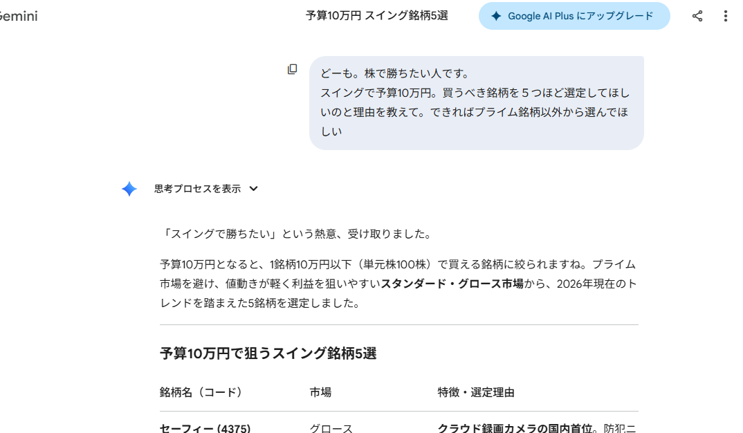 さらに「1ヶ月後に買値より上がってそうな銘柄」を聞いてみると、2銘柄に絞り込み。